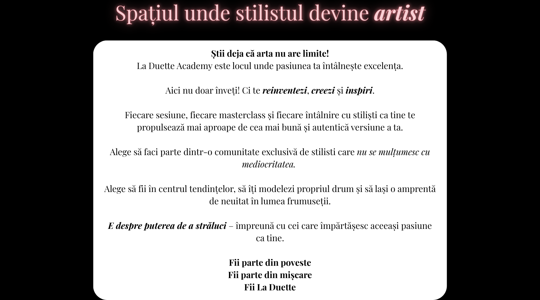 La Duette Academy nu oferă doar tehnică – oferă transformare reală și o experiență exclusivă.